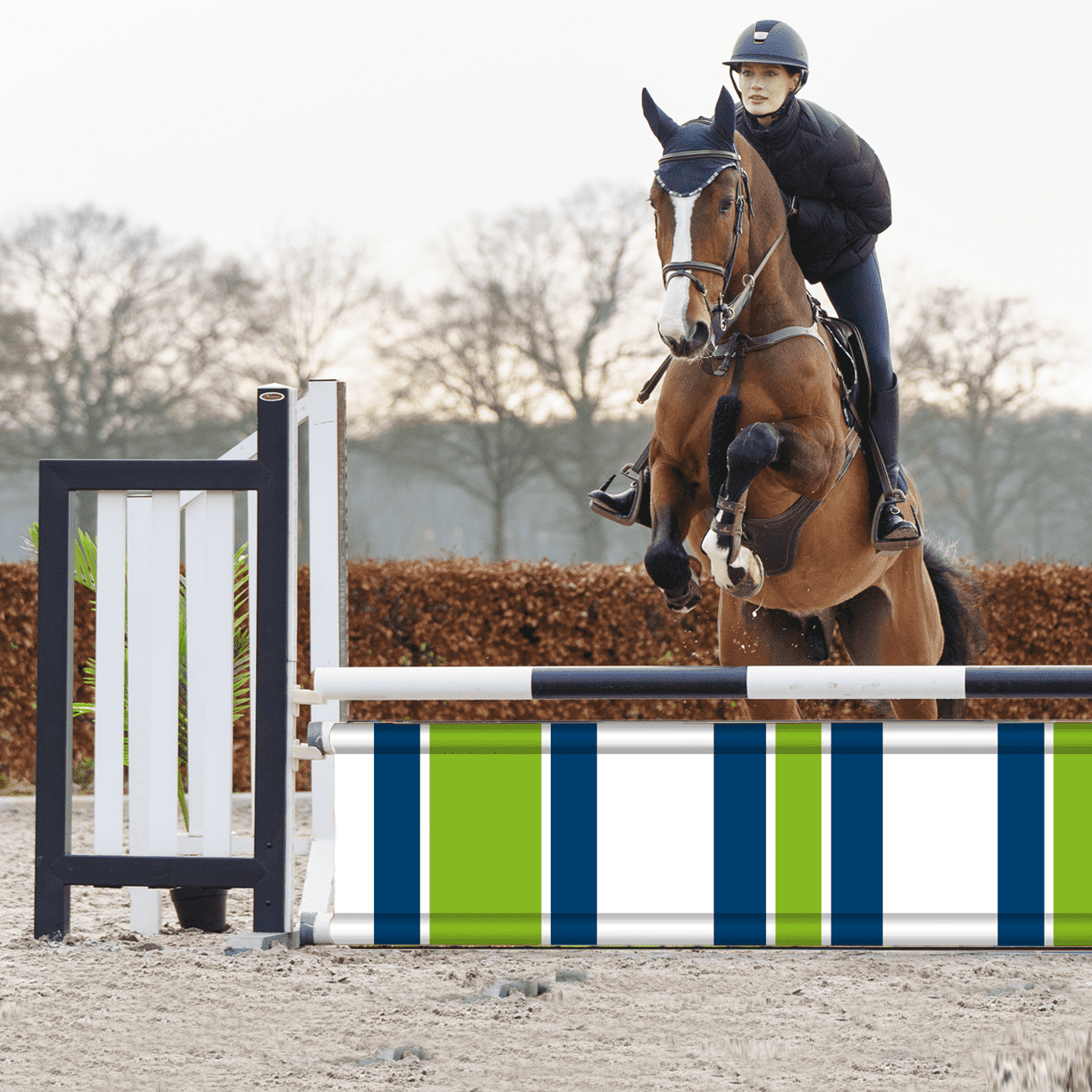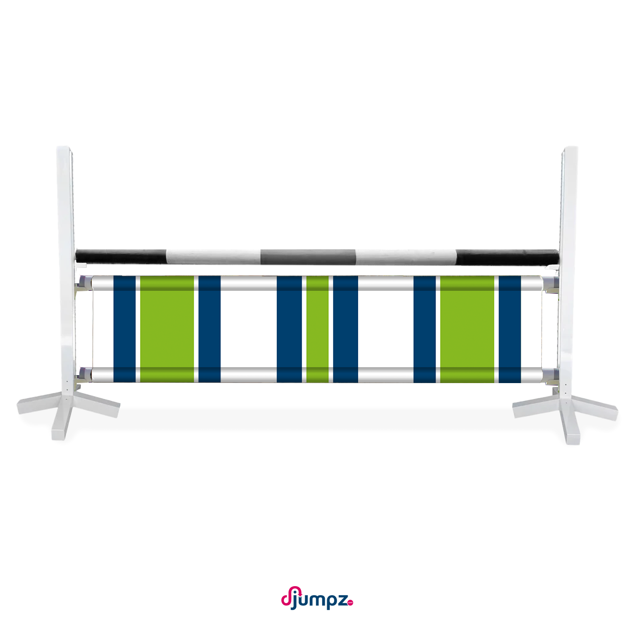 Hindernisdoek / Jumpbanner uit de Basics serie. Vrolijk hindernisdoek met groen en blauwe kleurbanen. Past perfect bij een hindernis met blauw/witte en groen/witte hindernisbalken.